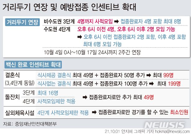 [서울=뉴시스] 수도권 4단계, 비수도권 3단계의 현행 사회적 거리두기가 2주 더 연장돼 오는 17일까지 적용한다. 단 결혼식은 최대 199명, 돌잔치는 49명 등 일부 업종과 상황에 따라 코로나19 백신 접종 완료자를 대상으로 인원 제한을 완화된다. (그래픽=안지혜 기자) [email protected]