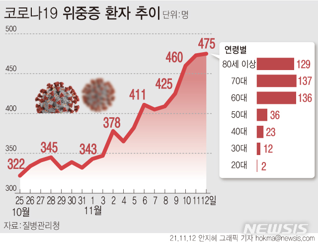 [서울=뉴시스] 질병관리청에 따르면 12일 0시 기준 재원 중인 코로나19 위중증 환자 수는 475명이다. 재원 중인 위중증 환자 수는 10일 460명부터 11일 473명, 12일 475명 등 연일 최다치다. (그래픽=안지혜 기자) [email protected]