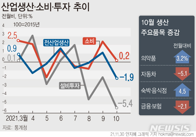 [서울=뉴시스] 지난달 전(全)산업 생산이 전월보다 1.9% 감소하며 1년 6개월 만에 최대 폭으로 감소했다. 설비투자 또한 17개월 만에 가장 크게 감소했다. 소비는 0.2% 늘었으나 증가 폭은 둔화됐다. (그래픽=안지혜 기자) [email protected]