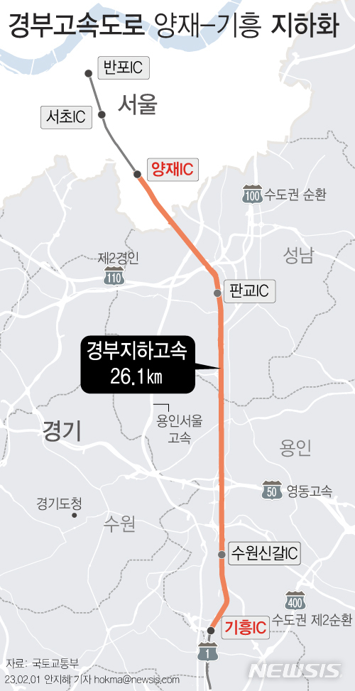 [서울=뉴시스] 국토교통부는 서울특별시, 경기도, 한국도로공사와 경부(용인-서울) 지하고속도로 사업의 원활한 추진을 위해 업무협약을 체결했다고 1일 밝혔다. 이 사업은 용인 기흥IC에서 양재IC 구간 26㎞에 4~6차로의 지하고속도로를 짓는 것이다. 오는 2027년 하반기 착공이 목표다. (그래픽=안지혜 기자) [email protected]