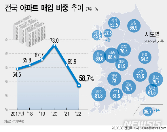 [서울=뉴시스] 8일 부동산 정보제공 업체 경제만랩에 따르면 지난해 전국 주택 거래량은 50만8790건으로 나타났다. 이 중 아파트 비중은 58.7%다. 고금리와 아파트 가격 하락전환으로 비교적 가격이 저렴한 빌라 매입 비중이 높아진 것으로 풀이된다. (그래픽=전진우 기자) [email protected]
