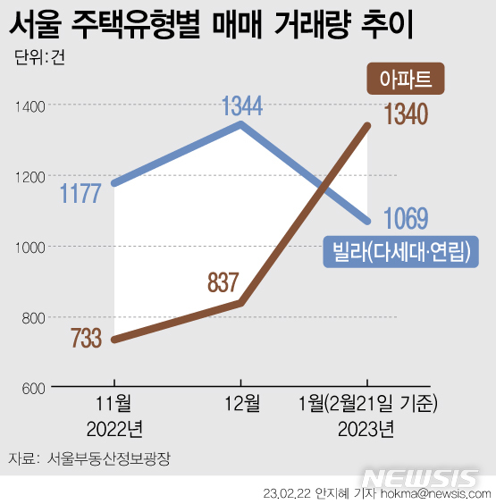 [서울=뉴시스] 올해 들어 아파트 거래량이 소폭 늘어난 데 비해 빌라(연립·다세대) 시장은 역대급 거래 위축 상황이 지속되고 있다. 최근 잇따라 발생한 빌라왕 전세 사기 사건으로 인해 빌라에 대한 인식이 나빠지면서 시장 위축이 이어진 것으로 풀이된다. (그래픽=안지혜 기자) [email protected]