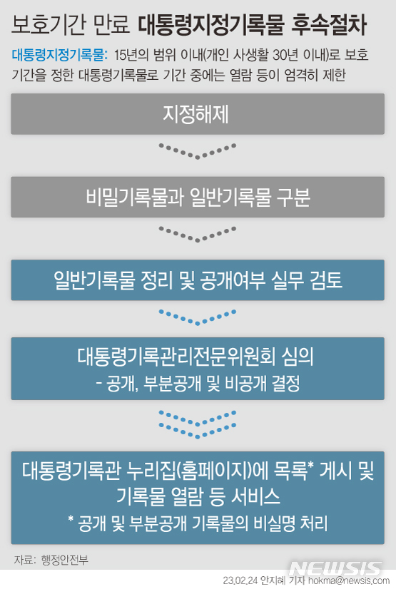 [서울=뉴시스] 행정안전부 대통령기록관은 대통령지정기록물 9만8000여 건에 대한 보호 기간이 25일 만료돼 해제된다고 밝혔다. 해제 대상은 보호 기간 15년인 제16대 고(故) 노무현 대통령 지정기록물 8만4000여 건과 보호 기간 10년인 제17대 이명박 대통령 지정기록물 1만4000여 건이다. 일반기록물에 대해서는 공개 여부를 실무 검토하고 대통령기록관리전문위원회 심의를 거쳐 '공개-부분공개-비공개'를 결정한다. (그래픽=안지혜 기자) [email protected]