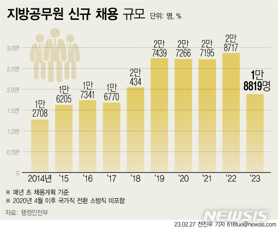 [서울=뉴시스] 27일 행정안전부에 따르면 올해 지방공무원 1만8819명을 뽑는다. 6년 만에 가장 적은 규모다. 역대 가장 많이 뽑았던 지난해의 2만8717명 대비로는 34.5% 줄었다. (그래픽=전진우 기자) [email protected]