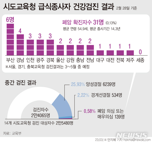 [서울=뉴시스] 교육 당국이 학교 급식실 만 55세 이상 또는 경력 10년 이상 종사자를 대상으로한 폐암 건강검진 결과를 공개했다. 정부는 이번 검진 결과를 바탕으로 후속 연구를 실시, 보다 엄밀한 상관관계를 분석할 방침이다. (그래픽=안지혜 기자) [email protected]
