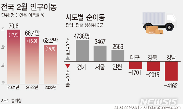 [서울=뉴시스] 부동산 시장 거래 절벽과 이동이 활발한 20·30대 인구가 줄어들면서 지난달 국내 인구 이동자 수가 2월 기준 29년 만에 최저 수준을 기록했다. (그래픽=안지혜 기자) [email protected]