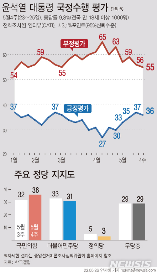 [서울=뉴시스] 한국갤럽이 5월 넷째주 윤석열 대통령의 직무수행 평가를 조사한 결과 36%가 긍정 평가했다. 해당 기관 조사에서 윤 대통령 지지율은 3주 연속 오름세를 보이다 이번 주 소폭 하락했다. 부정 평가도 전주 대비 1%포인트 하락해 55%로 집계됐다. (그래픽=안지혜 기자) [email protected]