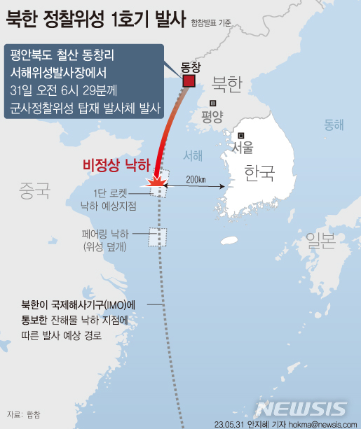 [서울=뉴시스] 북한이 31일 오전 6시29분께 평안북도 동창리 일대에서 남쪽 방향으로 발사한 이른바 우주발사체 1발이 어청도 서방 200여㎞ 해상에 떨어졌다고 합동참모본부가 밝혔다. 군은 발사체의 기종과 비행거리 등 자세한 제원을 분석하고 있다. (그래픽=안지혜 기자) [email protected]