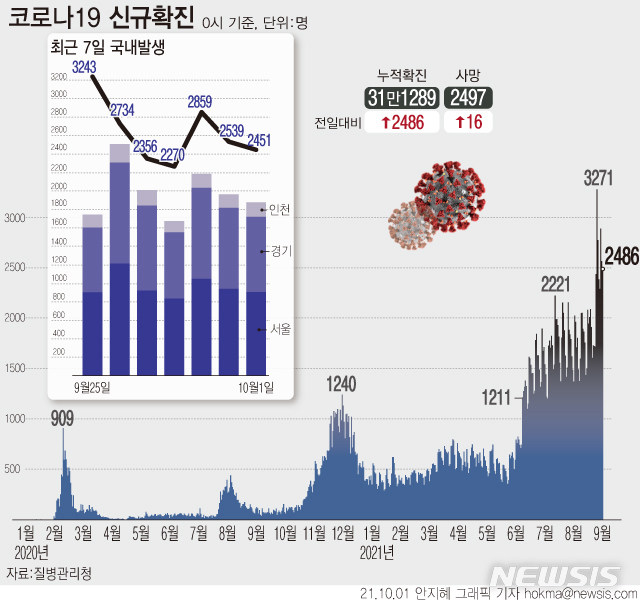 [서울=뉴시스] 1일 0시 기준 코로나19 신규 확진자가 2486명으로 집계됐다. 장기간 대유행 여파로 신규 사망자는 하루에 16명이 늘었다. (그래픽=안지혜 기자) [email protected]