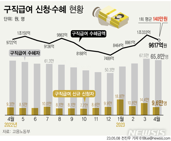 [서울=뉴시스] 8일 고용노동부에 따르면 지난달 10개월 만에 1조원을 돌파한 구직급여(실업급여) 지급액은 9617억원으로 소폭 줄어들었다. 전년 동월과 비교해도 106억원 감소했다. 구직급여 신규 신청자수는 9만6000명으로, 3월 말 대비 5만명가량 감소했다. (그래픽=전진우 기자) [email protected]