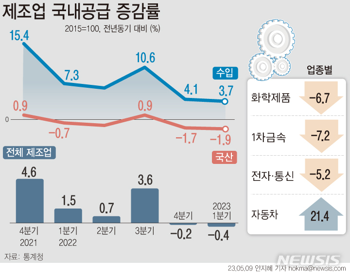 [서울=뉴시스] 내수시장의 동향을 보여주는 제조업 제품 국내 공급이 2분기 연속 감소한 것으로 나타났다. 수입 공급은 3.7% 증가하며 11분기 연속 증가세를 보였다. 제조업 국내 공급에서 수입이 차지하는 비중은 28.6%로 전년보다 0.5%포인트(p) 상승했다. (그래픽=안지혜 기자) [email protected]