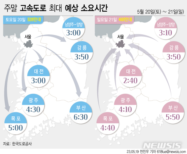 [서울=뉴시스] 19일 한국도로공사에 따르면 5월 세 번째 주말 고속도로 교통량은 대체로 맑은 날씨에 지난주보다 증가할 것으로 전망했다. 교통상황은 주말 나들이 차량으로 인해 다소 혼잡한 수준일 것으로 전망했다. (그래픽=전진우 기자) [email protected]