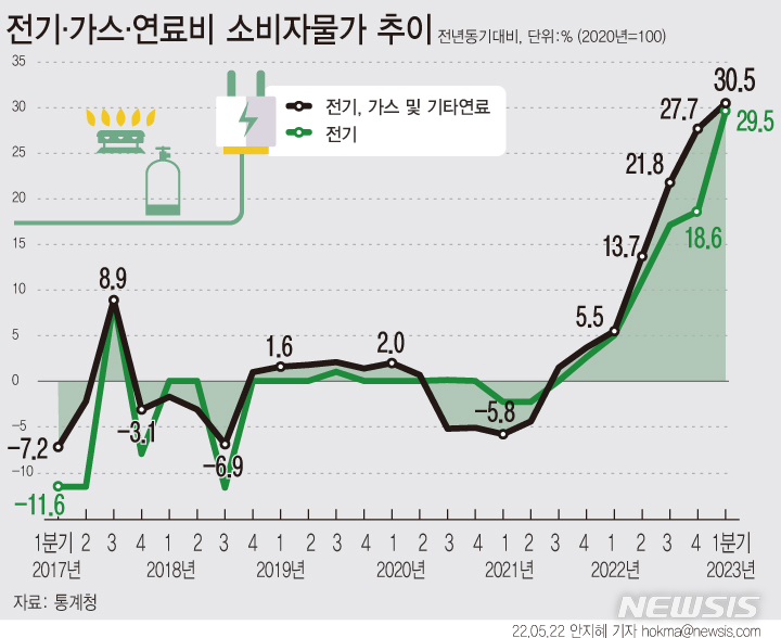 [서울=뉴시스] 22일 통계청이 '소비자물가동향'을 지출목적별로 분석한 결과에 따르면 1분기 전기, 가스 및 기타 연료 물가지수는 135.49(2020년=100)로 전년보다 30.5% 상승했다. 전기요금의 물가지수는 136.48로 1년 전보다 29.5% 올랐다. 이는 관련 통계가 작성된 1975년 이래 최대 상승률이다. (그래픽=안지혜 기자) [email protected]