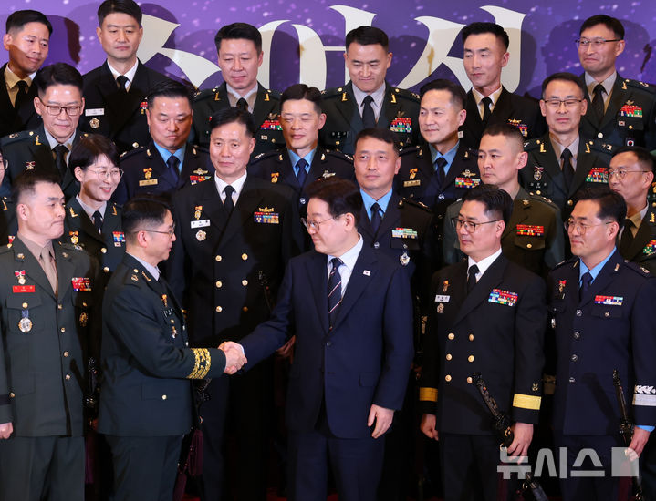 진급 장성들과 기념촬영 하는 이재명 대통령