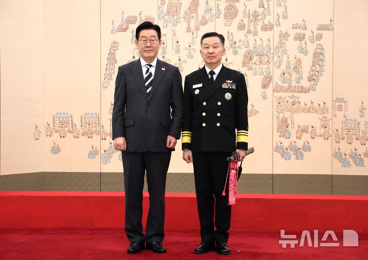 곽광섭 해군참모차장과 기념촬영 하는 이재명 대통령