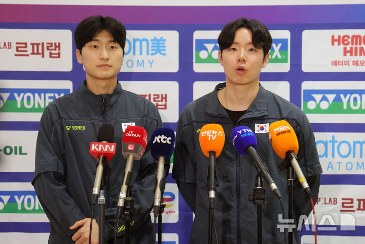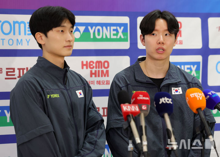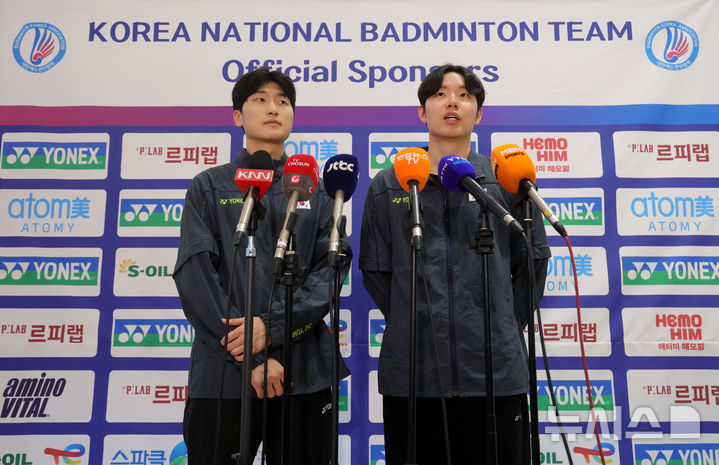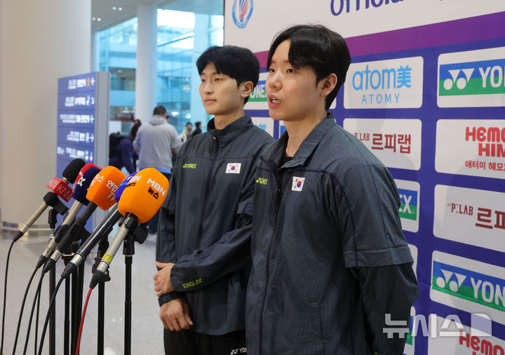 배드민턴 남자복식 40년 만에 2연패, 귀국 인터뷰하는 김원호-서승재