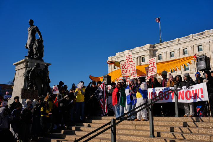 미네소타주 의사당 앞에 모인 반 ICE 시위대