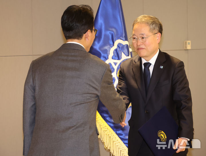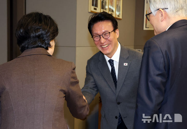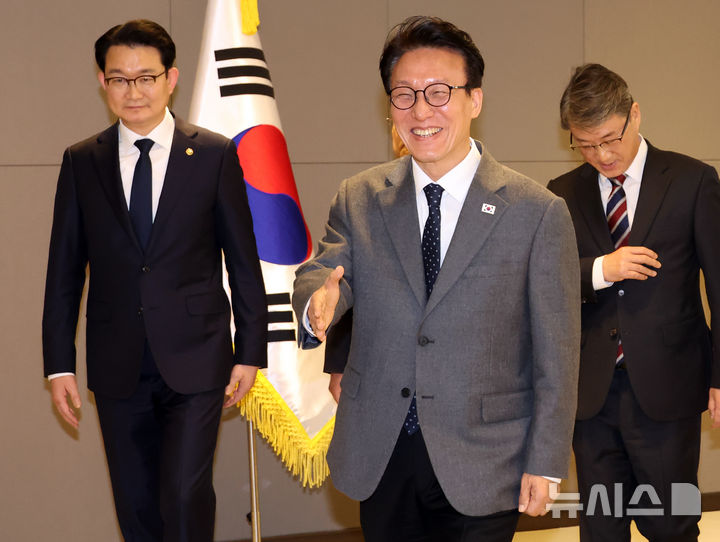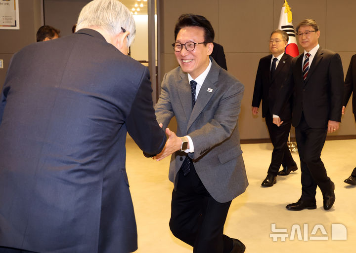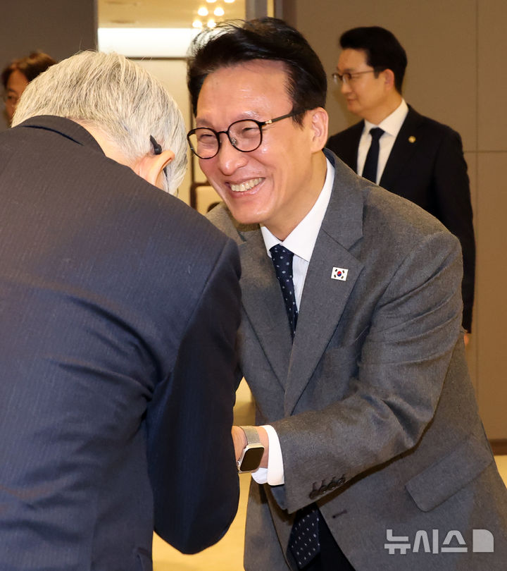 밝은 표정으로 악수하는 김민석 총리
