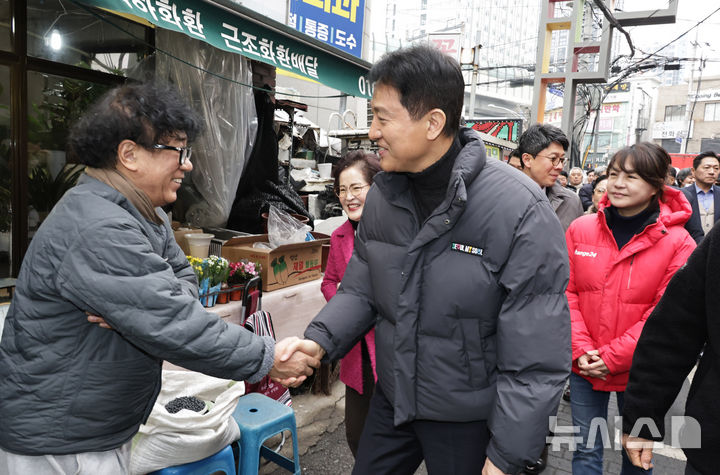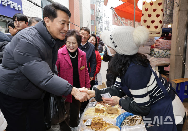자양전통시장에서 주민과 악수하는 오세훈 서울시장