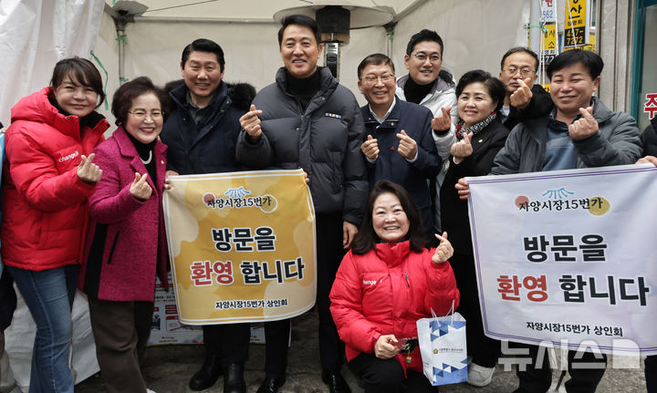 자양전통시장에서 기념촬영하는 오세훈 서울시장