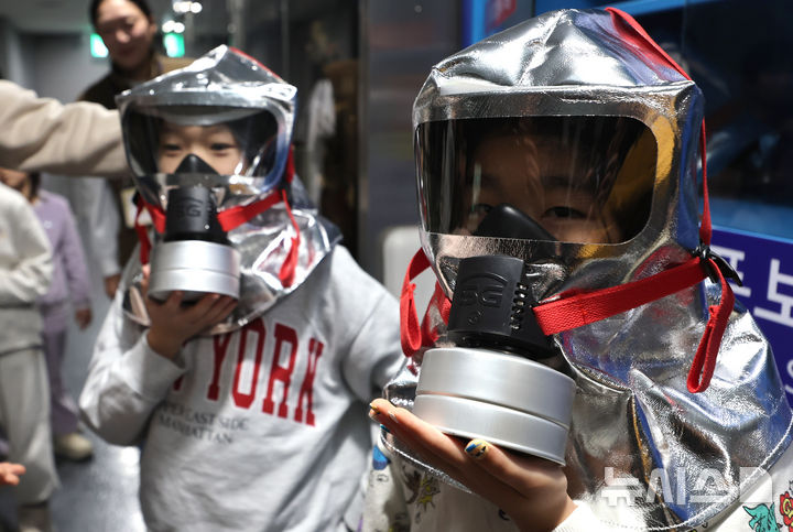 지하철 화재시 마스크 착용 체험하는 어린이들