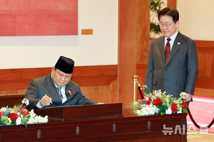방명록 서명하는 프라보워 수비안토 인도네시아 대통령