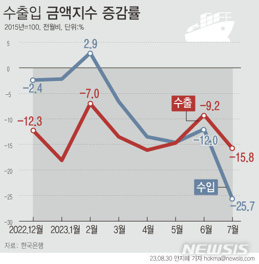 [서울=뉴시스] 7월 우리나라 교역조건이 2개월 연속 개선됐다. 수입가격 내림세가 수출가격 하락세보다 더 컸기 때문이다. 교역조건 지수는 통관 기준으로 작성되는데 수입가격이 16.8% 내린 반면 수출가격은 12.6% 내리는데 그쳤다. (그래픽=안지혜 기자) [email protected]