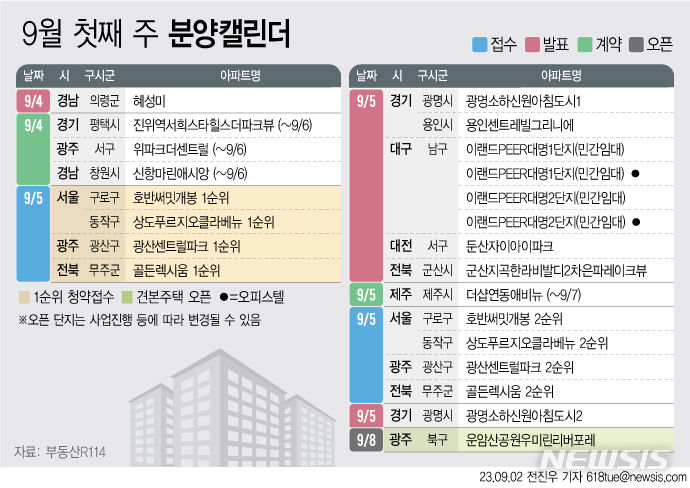 [서울=뉴시스] 2일 부동산R114에 따르면 9월 첫째 주에는 전국 4개 단지 총 1527가구(일반분양 1120가구)가 분양을 시작한다. (그래픽=전진우 기자) [email protected]