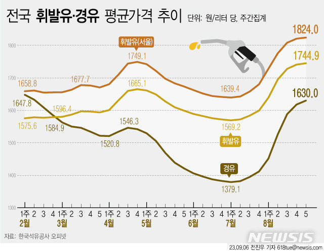 [서울=뉴시스] 6일 한국석유공사가 운영하는 오피넷에 따르면 지난달 5주차 주유소 휘발유 판매가격은 ℓ(리터)당 1744.9원으로 전주 대비 4.2원 상승해 8주째 오름세를 이어가고 있다. 지역별 최고가인 서울은 전주 대비 3.5원 오른 1824.0원으로 이미 1800원을 넘어섰다. (그래픽=전진우 기자) [email protected]
