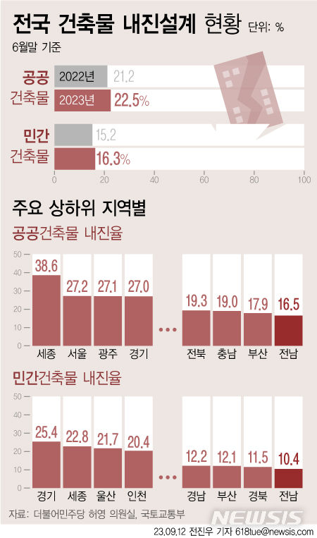 [서울=뉴시스] 12일 더불어민주당 허영 의원실에 따르면 올해 6월말 기준으로 전국 건축물의 내진율은 16.4%에 불과한 것으로 나타났다. 공공과 민간건축물 내진율이 각각 22.5% 와 16.3%로 전년 대비 소폭 상승했으나 여전히 낮은 수준이다. 내진율이 낮은 곳은 전남이다. (그래픽=전진우 기자) [email protected]