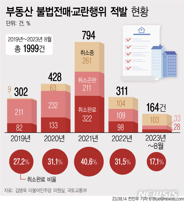 [서울=뉴시스] 14일 김병욱 더불어민주당 의원실에 따르면 지난 2019년부터 올해 8월까지 최근 5년 간 주택 불법전매 및 공급질서 교란행위로 검찰·경찰 등에 적발된 건수가 총 1999건에 달했고, 이 중 계약취소가 완료된 주택은 3분의 1 수준인 것으로 파악됐다. (그래픽=전진우 기자) [email protected]