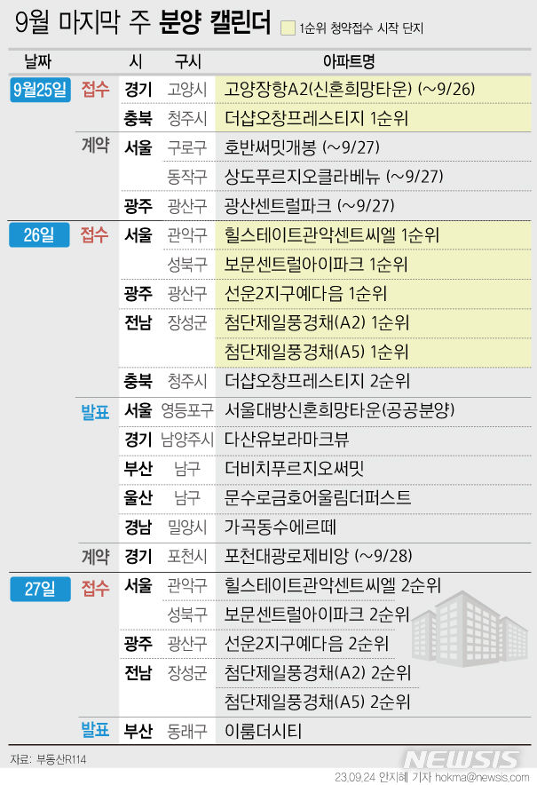 [서울=뉴시스] 부동산R114는 9월 마지막 주 전국 6개 단지에서 아파트 5194가구(일반분양 4027가구)가 분양을 시작한다고 24일 밝혔다. (그래픽=안지혜 기자) [email protected]