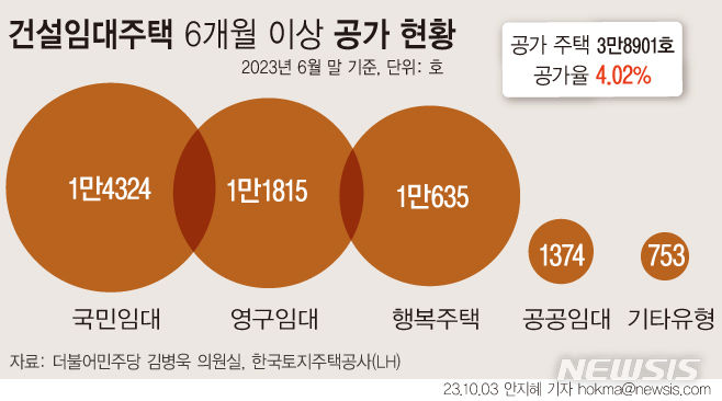 [서울=뉴시스] 3일 더불어민주당 김병욱 의원이 한국토지주택공사(LH)로부터 제출받은 '임대주택 공가 현황'에 따르면 지난 6월 말 기준으로 6개월 이상 비어 있는 공공 임대주택 공가(空家)가 4만3760가구에 달했다. 건설임대주택 유형별로는 국민임대 1만4324가구, 영구임대 1만1815가구, 행복주택 1만635가구 등으로 나타났으며, 행복주택의 공가율이 9.0%로 가장 높았다. (그래픽=안지혜 기자) [email protected]
