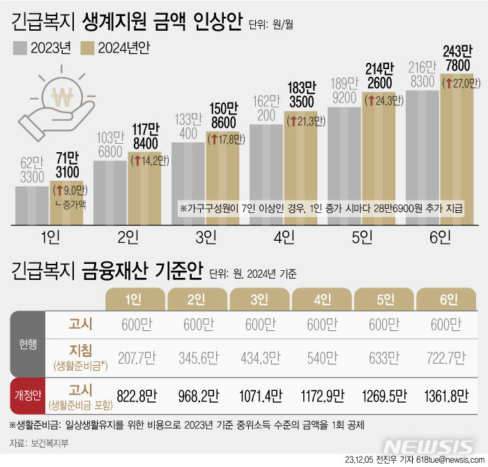 [서울=뉴시스] 5일 보건복지부에 따르면 실직이나 휴·폐업, 중대 질병·부상 등으로 생계를 유지하기 어렵게 된 저소득층에 일시적으로 생계를 지원하는 긴급복지 생계지원금이 내년에 4인 가구 기준 162만원에서 183만원으로 약 21만원(13.16%) 인상된다. (그래픽=전진우 기자) [email protected]