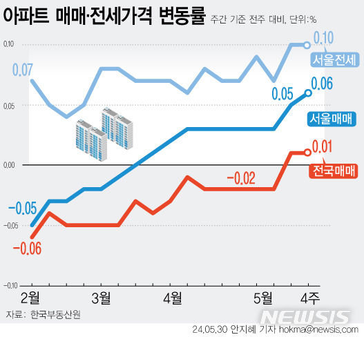 [서울=뉴시스] 30일 한국부동산원에 따르면 5월 넷째주(27일 기준) 전국 주간 아파트 매매가격이 0.01% 상승해 전주와 같은 수준을 유지했다. 수도권(0.02%→0.03%) 및 서울(0.05%→0.06%)은 상승폭 확대, 지방(0.00%→-0.01%)은 하락 전환했다. 경기(-0.01%→0.00%)는 보합 전환했다. (그래픽=안지혜 기자) [email protected]