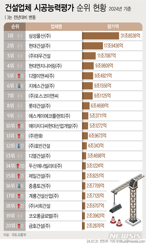 [서울=뉴시스] 올해 건설사 시공능력평가 결과 삼성물산이 11년 연속 1위 자리를 지켰다. 현대건설 2위, 대우건설 3위, 현대엔지니어링 4위로 최상위권은 지난해와 순위가 동일했다. 5위와 6위는 각각 DL이앤씨와 GS건설로 지난해와 자리를 맞바꾸었다. 지난해 10위권 밖으로 밀려났던 HDC현대산업개발은 10위를 차지하며 재진입에 성공했다. (그래픽=전진우 기자) [email protected]