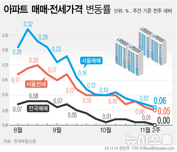[서울=뉴시스] 14일 한국부동산원이 11월 둘째 주 주간 아파트가격 동향을 조사한 결과 서울 아파트 매매가격 상승폭이 4주 연속으로 줄어들고 있다. 전국 아파트값은 지난주와 변동이 없었다. (그래픽=전진우 기자) [email protected]