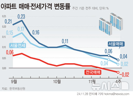 [서울=뉴시스] 전국 아파트 매매가격이 2주 연속 하락했다. 서울 아파트 값은 상승폭이 둔화 됐다. 1기 신도시 재건축 호재가 반영된 평촌, 중동 등 일부 수도권 집값은 올랐다. (그래픽=안지혜 기자) [email protected]