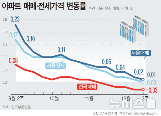 [서울=뉴시스] 전국 아파트가격이 5주 연속 하락세를 이어갔다. 하락폭은 지난주(-0.03%)와 같았다. 서울(0.02%→0.01%) 상승폭이 전주 대비 축소됐다. 서울(0.01%→0.00%)아파트 전셋값은 보합으로 전환됐다. (그래픽=안지혜 기자) [email protected]