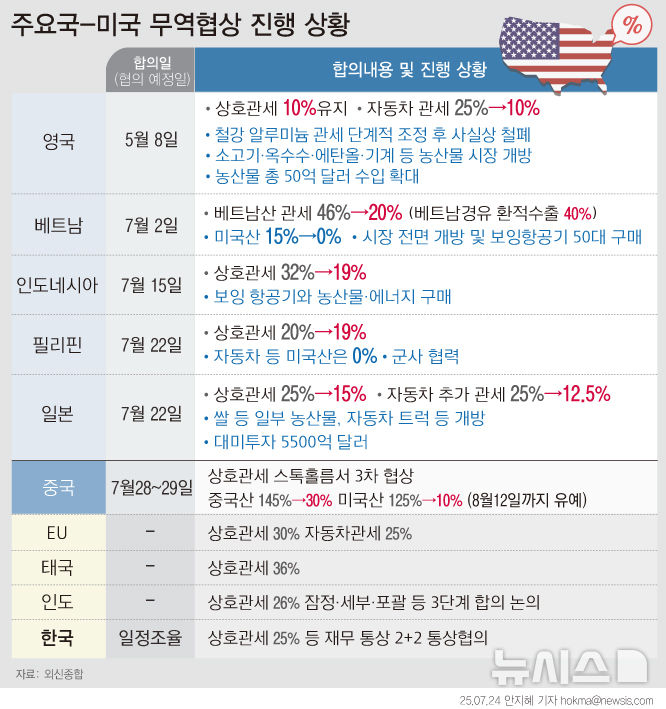 [서울=뉴시스] 도널드 트럼프 미국 대통령이 관세 유예 종료일인 8월 1일 이후 무역 비합의 국가에 최대 50%의 고율 관세를 예고했다. 한편, 일본과는 ‘5500억 달러 투자’라는 보너스를 받고 관세를 15%로 낮춘 협상을 체결했다고 자평했다. 트럼프 대통령의 상호관세 발표 이후 미국과 무역협상을 타결한 국가는 영국·베트남·인도네시아·필리핀에 이어 일본까지 총 5개국으로 늘었다. (그래픽=안지혜 기자) [email protected]