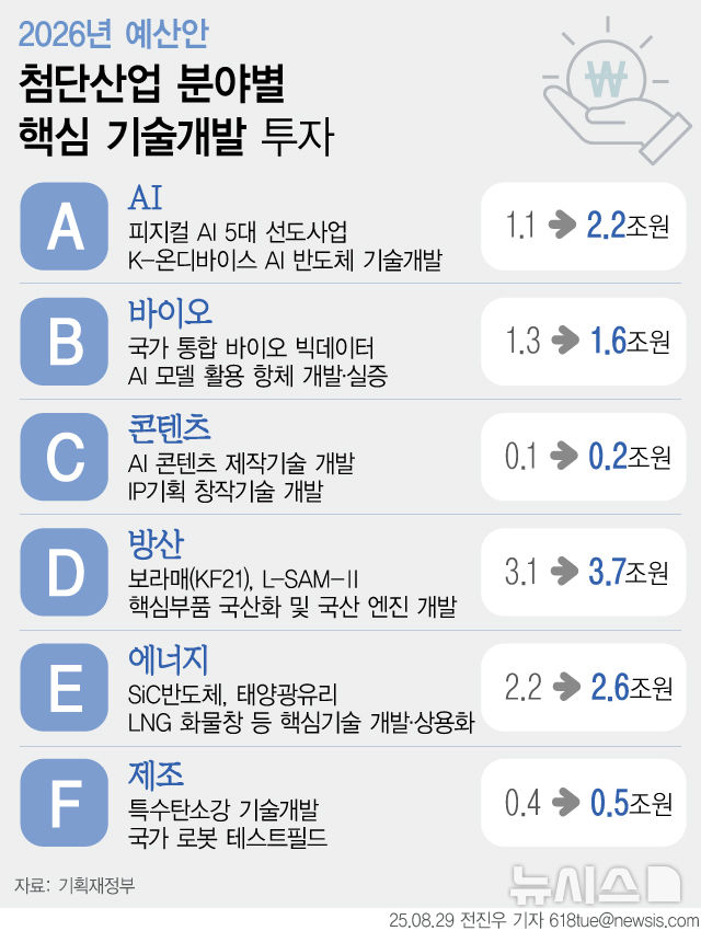 [서울=뉴시스] 29일 정부에 따르면 이재명 정부가 내년도 연구개발(R&D) 예산을 '역대 최대' 수준인 19.3% 증액 편성한다. 윤석열 정부에서 삭감됐던 R&D 예산을 대폭 확충해 '초혁신 경제 실현'에 속도를 낸다는 구상이다. 특히 'ABCDEF'(인공지능·바이오·문화콘텐츠·방위산업·에너지·첨단제조업) 등 6대 첨단산업에 투자를 집중하고, 기초연구부터 민간 사업화까지 이어지는 혁신 생태계를 강화함으로써 미래 성장동력을 확보한다. (그래픽=전진우 기자) [email protected]