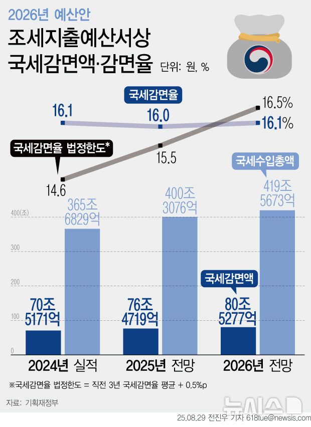 [서울=뉴시스] 29일 기획재정부에 따르면 정부가 깎아주는 내년 세금 규모가 80조원을 넘어설 전망이다. 국세감면율은 올해까지 3년 연속 법정한도를 초과했지만, 내년에는 16.1%로 법정한도(16.5%)보다 0.4%포인트 낮을 것으로 예상된다. (그래픽=전진우 기자) [email protected]