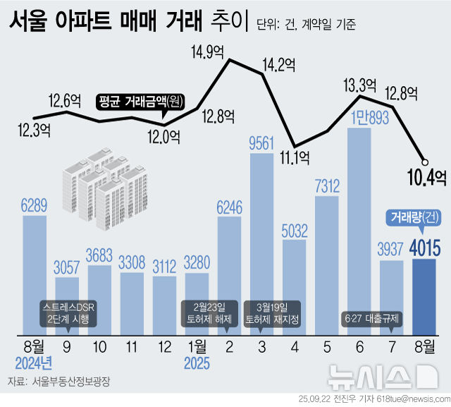[서울=뉴시스] 22일 서울부동산정보광장에 따르면 8월 서울 아파트 매매 거래량은 4015건으로 한 달 전인 7월(3937건)을 넘어섰다. 대출 규제 발표 전인 6월 1만893건에서 3000건대로 곤두박질친 지 한달만에 거래량이 반등했다. (그래픽=전진우 기자) [email protected]