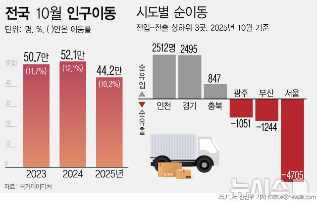 [서울=뉴시스] 26일 국가데이터처에 따르면 10월 전체 이동자 수는 44만2000명으로 전년 동월보다 7만9000명(-15.2%) 감소했다. 이는 1974년 41만명 이후 가장 낮은 규모다. (그래픽=전진우 기자) [email protected]