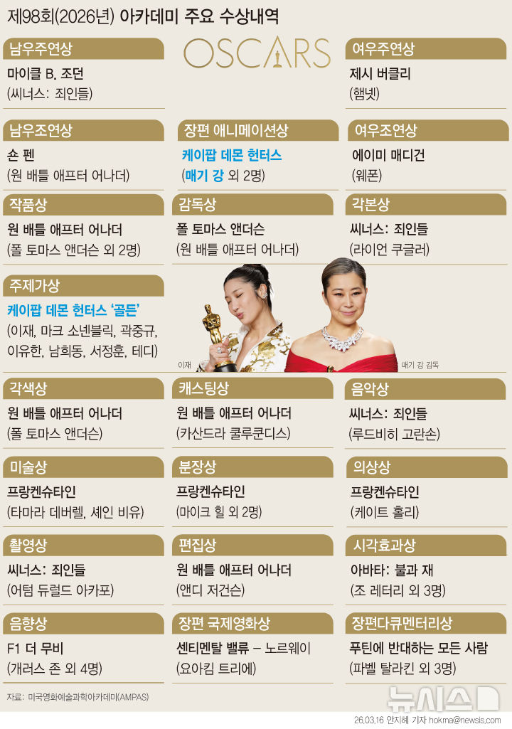 [서울=뉴시스] '케이팝 데몬 헌터스'는 15일(현지 시각) 미국 로스엔젤레스(LA) 할리우드 돌비극장에서 열린 98회 미국아카데미(오스카)시상식에서 장편애니메이션상과 주제가상 등 2관왕에 올랐다. 공동연출을 맡은 매기 강 감독은 아카데미에서 장편애니메이션상을 받은 첫 번째 한국계 연출가가 됐고, 한국인·한국계 가수·작곡가가 오스카 주제가상을 받은 것도 이번이 처음이다. (그래픽=안지혜 기자) [email protected]