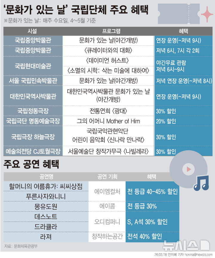 [서울=뉴시스] 다음 달부터 ‘문화가 있는 날’이 마지막 주 수요일 1회에서 매주 수요일로 확대된다. 박물관·미술관 야간 개방과 공연 할인, 심야 서점 등 문화 프로그램도 늘어난다. 국립중앙박물관과 국립현대미술관 등 주요 국립기관은 야간 개방과 교육 프로그램을 확대하고, 민간 공연계도 관람권 할인과 잔여석 특별 할인 등을 제공할 예정이다. 다만 영화관 등 민간 시설·기관의 부담 우려를 반영해 할인 운영은 자율 참여 방식으로 전환된다. (그래픽=안지혜 기자) [email protected]