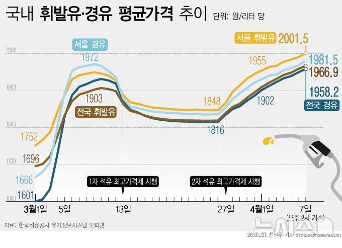 [서울=뉴시스] 7일 한국석유공사 유가정보시스템 오피넷에 따르면 이날 오후 2시 기준 서울 지역 평균 휘발유 가격이 2001.5원을 기록했다. (그래픽=전진우 기자) [email protected]