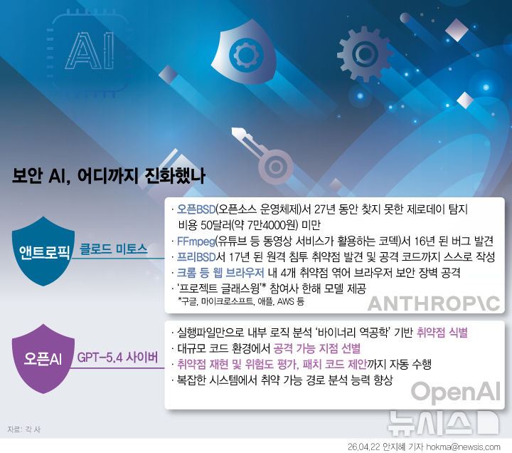 [서울=뉴시스] 지금까지 AI는 보안 전문가를 돕는 ‘조수’ 역할에 머물렀다. 앤트로픽 '미토스', 오픈AI 'GPT-5.4 사이버' 등 '자율형 AI'는 스스로 공격 경로를 짜고 코드까지 만든다. 실제로 '미토스'는 기존 소프트웨어에서 수천 건의 신규 취약점(제로데이)을 찾아내 공격 코드로 연결하는 능력을 증명했다. 전문가들은 금융·에너지·국방 등 핵심 인프라가 여전히 오래된 시스템 위에 구축돼 있어 위험 노출 가능성이 커질 수 있다고 보고있다. (그래픽=안지혜 기자) [email protected]