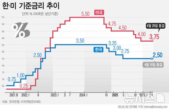 [서울=뉴시스] 미국 연방준비제도가 29일(현지시간) 기준금리를 3.5~3.75%로 동결했다. 연준은 인플레이션 지속과 글로벌 에너지 가격 상승을 동결 이유로 제시했다. 당초 만장일치 동결이 예상됐던 이번 FOMC에서는 1명의 위원이 금리 인하를 주장했고 3명은 '성명에 완화 기조 포함 반대'를 주장하는 등 반대표는 4명으로 나타났다. (그래픽=안지혜 기자) [email protected]