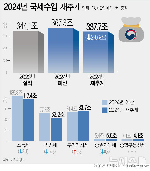 [서울=뉴시스] 26일 기획재정부는 올해 국세수입이 예산 367조3000억원 대비 29조6000억원 부족한 337조7000억원으로 예상했다. (그래픽=전진우 기자) [email protected]